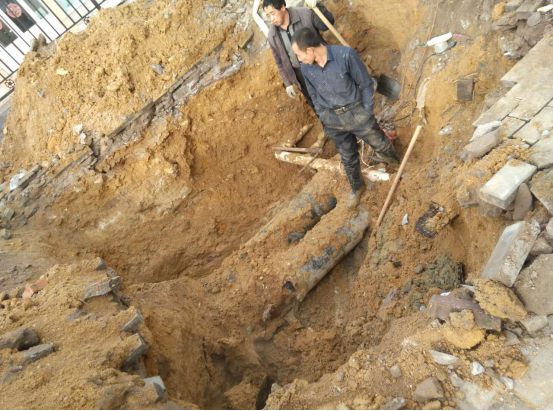 第二天上午,組織保安、辦公室人員、維修工積極參與搶修工作,測(cè)定跑水管范圍后開(kāi)始挖溝,挖到1.5米深后,找到了供暖管道,坑里向外冒水,但是未能找到管道的準(zhǔn)確漏水處,此時(shí)是下午四點(diǎn)多。供暖已停,大家都已累的精疲力盡,為了搶時(shí)間,與業(yè)委會(huì)溝通雇來(lái)兩名工人,擴(kuò)大坑道,發(fā)現(xiàn)供熱主管道也從這里經(jīng)過(guò),兩根排污也交織在一起,但水仍往出冒,還是找不到漏水管位置。