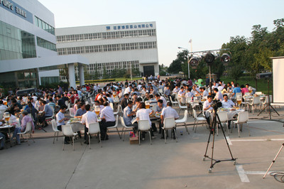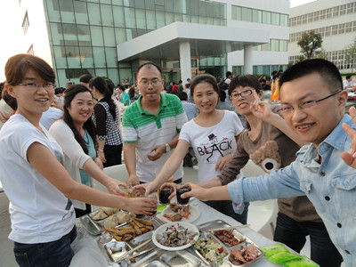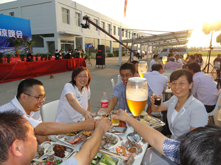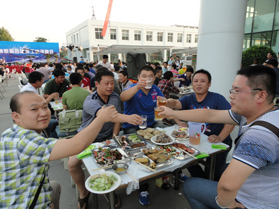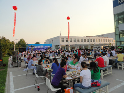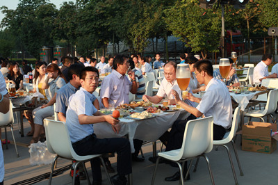 24日下午,公司辦公樓前,擺放著一排排桌椅,員工們從餐廳端著盛滿豐盛食物的餐盤,擺放在餐桌上。南面的舞臺上,工作人員在緊張的調(diào)試音響,兩只紅色的氫氣球飄揚在空中,在蔚藍的天空映襯下,格外的鮮艷,為整個會場增添了喜慶的氣氛。