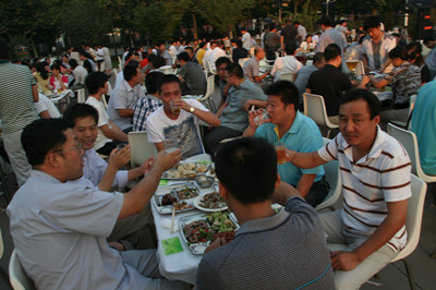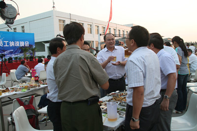 17:30分, “第四屆員工納涼晚會”正式開始。首先是員工聚餐。近400名員工,伴著歡快的樂曲聲,推杯換盞,大快朵頤。公司總經(jīng)理志賀進、常務(wù)副總經(jīng)理王正軍等公司領(lǐng)導走入員工中,與員工們親切交談,敬酒祝愿,整個會場洋溢著一張張歡樂的笑臉。