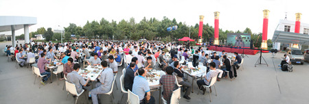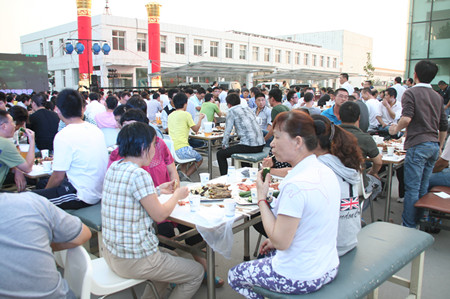 下午5點(diǎn),在夕陽的映照中,公司辦公樓前,忙碌的員工穿梭在會場,辦公樓南面已搭建好舞臺,碩大的LED屏矗立在舞臺上。舞臺兩側(cè)各豎立著兩個(gè)團(tuán)結(jié)柱。舞臺前的空地上,已擺放好63張桌子,每張桌子配放6把椅子。桌子上,豐盛的飯菜已放好,靠西邊的草坪旁,是備好的新鮮的青島扎啤。